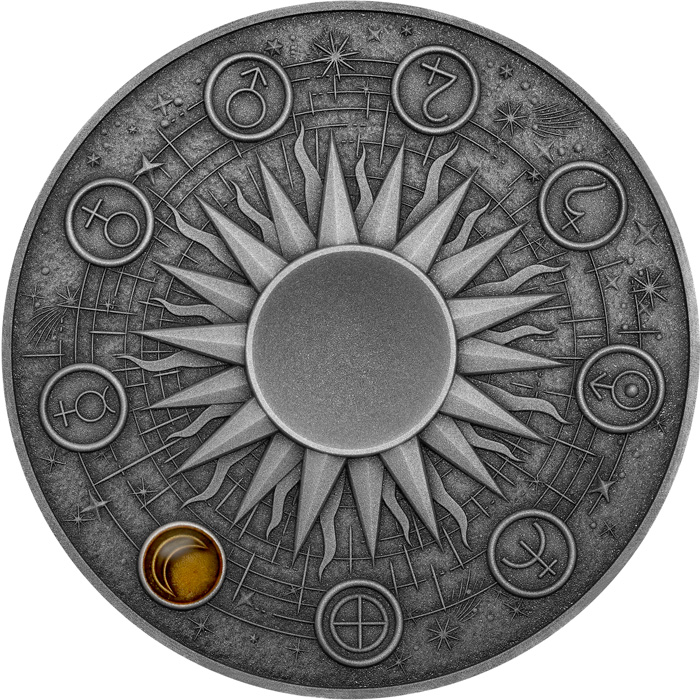 Motiv rubové strany mince ve svém středu znázorňuje ve vysokém reliéfu Slunce, jehož sluneční paprsky se dotýkají stylizované oběžné dráhy na pozadí. Po oběžné dráze jsou ve vysokém reliéfu patrné astronomické značky jednotlivých planet Sluneční soustavy. Značka Měsíce je pro zdůraznění zdobená digitálním značením. Minci doplňuje koule z minerálu Labradorit, který svým mnohobarevným leskem a našedlou barvou připomíná proměnlivé stíny povrchu Měsíce. Koule se ukládá do prohlubně ve středu Slunce díky čemuž se z mince stává elegantní podstavec.