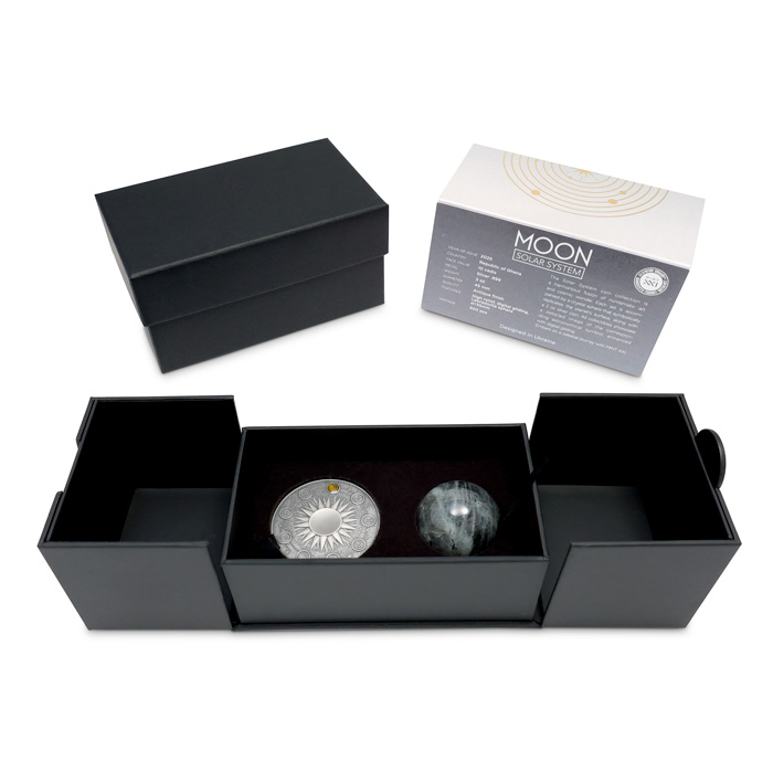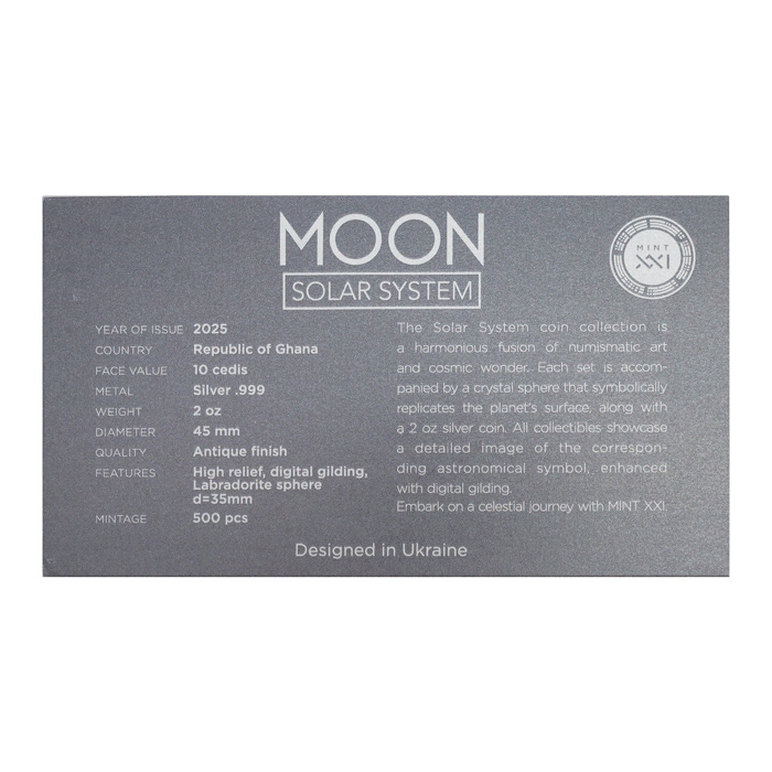 Stříbrná mince s koulí z Labradoritu je vydaná Ghanskou republikou pro rok 2025 a ražená z nejčistšího 99,9% stříbra o váze 2 Oz (62,2 g) v precizním provedení Antique. Série Solar systém nabízí v originálních zmenšených modelech planety Sluneční soustavy. Třetí mince série zobrazuje Měsíc.
