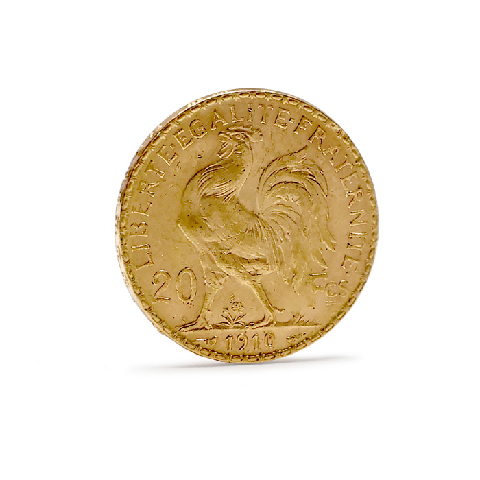 Francouzský 20 franc Marianne Coq byla měna vydávaná za Třetí republiky v letech 1907 až 1914, v ryzosti 900/1000 Au (21,6 kt), váze 6,45 g a průměru 21 mm. Celková produkce mincí činila 74 414 415 kusů, přičemž mincí s ročníkem 1910 bylo vyraženo 5 779 072 ks. Autorem motivu byl francouzský sochař a medailista Jules-Clément Chaplain.