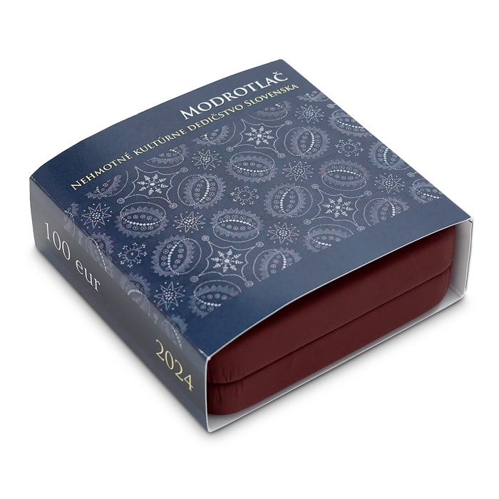 Na lícní straně je vyobrazena postava řemeslníka při vzorování plátna potiskem, doplněnou autentickou dřevěnou formou s kyticí v levé části a visící, již zabarvenou látkou v horní části mince. Motiv doplňuje označení nominální hodnoty „100 EURO“ ve středu mince. Spodní část uvádí uvádí rok emise „2024“, název země původu „SLOVENSKO“ a státní znak Slovenské republiky. Značka Mincovny Kremnica, tvořená stylizovanou zkratkou „MK“ je umístěna v levé spodní části modrotiskové formy. Stylizované iniciály autora Karola Ličky „KL“ jsou umístěny v pravé spodní části formy.